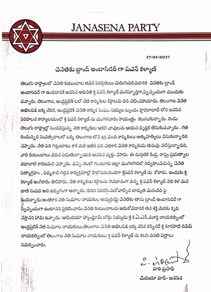 దీనితో ఆగకుండా, మంగళగిరిలో వచ్చేనెల జరగబోయే చేనేత సత్యాగ్రహానికి ముఖ్య అతిధిగా హాజారవుతానని వారికి మాట కూడా ఇచ్చాడు. పవన్ కి ఉన్న పాపులారిటీ దృష్ట్యా అతను తలుచుకుంటే అతిపెద్ద బ్రాండ్లకి ప్రచారకర్తగా మారి కోట్లు మూటకట్టుకోవచ్చు అలాంటి పవన్ ఇలా కష్టాల్లో ఉన్నవారికి తోడూ నిలబడటం నిజంగా అభినందిచాల్సిన విషయం.