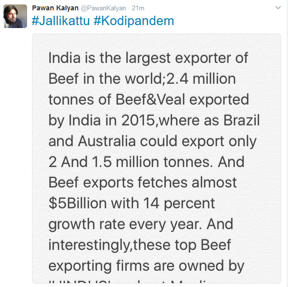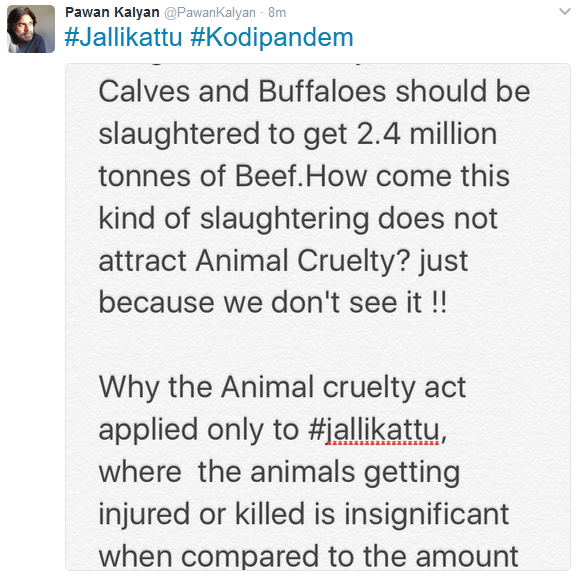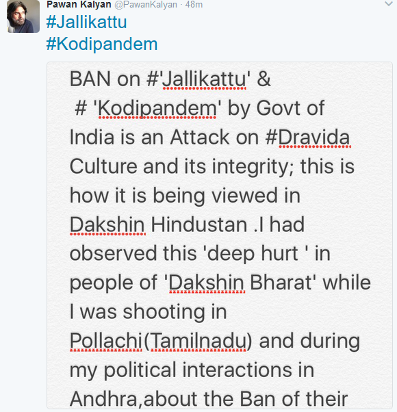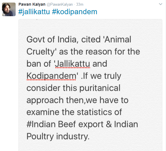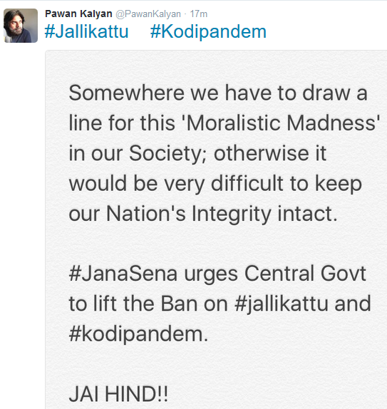ఇదిలా ఉంటే, తమిళ సినీప్రముఖుల నుండే కాక తెలుగు హీరోల నుండి కూడా దీనికి మద్దతు వ్యక్తం అవుతుంది. మహేష్ బాబు ఇప్పటికే తన మద్దతు ట్విట్టర్ ద్వారా తెలియచేసాడు. తాజాగా పవన్ కళ్యాణ్ సైతం ఈ ప్రజా ఉద్యమానికి తన గొంతు కలిపాడు.