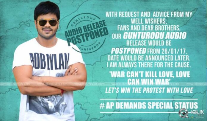 మంచు మనోజ్‌ హీరోగా నటించిన ‘గుంటూరోడు’ సినిమా ఆడియో విడుదల వేడుక పోస్ట్‌పోన్‌ అయ్యింది. ఆంధ్రప్రదేశ్‌లో ప్రత్యేక హోదా కోసం యువత ఉద్యమిస్తుండడంతో ఆ ఉద్యమానికి తాను మద్దతిస్తున్నట్లు మనోజ్‌ ప్రకటించాడు. ఇందులో భాగంగానే జనవరి 26న విడుదల కావాల్సి ఉన్న ‘గుంటూరోడు’ ఆడియో విడుదల వేడుక వాయిదా వేశారు. అదే రోజున విశాఖపట్నంలో యువత భారీ నిరసన కార్యక్రమాన్ని ప్రత్యేక హోదా కోసం చేపట్టనుంది.