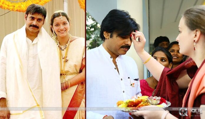 హీరోయిన్ రేణూ దేశాయ్తో సహజీవనం చేశాక, 2009 ఎన్నికలకు ముందు టైంలో ఆమెని అధికారికంగా పెళ్లి చేసుకున్నారు పవన్ కళ్యాణ్. ‘ప్రజారాజ్యం’ పార్టీ టైంలో ఆ పార్టీకి యూత్ వింగ్ అధ్యక్షుడిగా బాథ్యతలు నెరవేర్చినప్పుడు, రేణూ దేశాయ్ పవన్కి మోరల్ సపోర్ట్గా నిలిచింది. ఆ తర్వాత పవన్ కళ్యాణ్ ‘జనసేన’ పార్టీ స్థాపించడం, ఆ టైంలో అన్నా లెజినోవాతో పెళ్లి విషయం అధికారికంగా వెలుగులోకి రావడం జరిగింది. ఇదిలా ఉండగా, తాజాగా పవన్ కళ్యాణ్ జనసేన పార్టీ అధ్యక్షుడిగా ప్రజాయాత్ర ప్రారంభిస్తున్న సంగతి తెలిసిందే. దీని నిమిత్తం తన భార్య అయిన అన్నా లెజినోవా పవన్కి వీర తిలకం దిద్దారు.