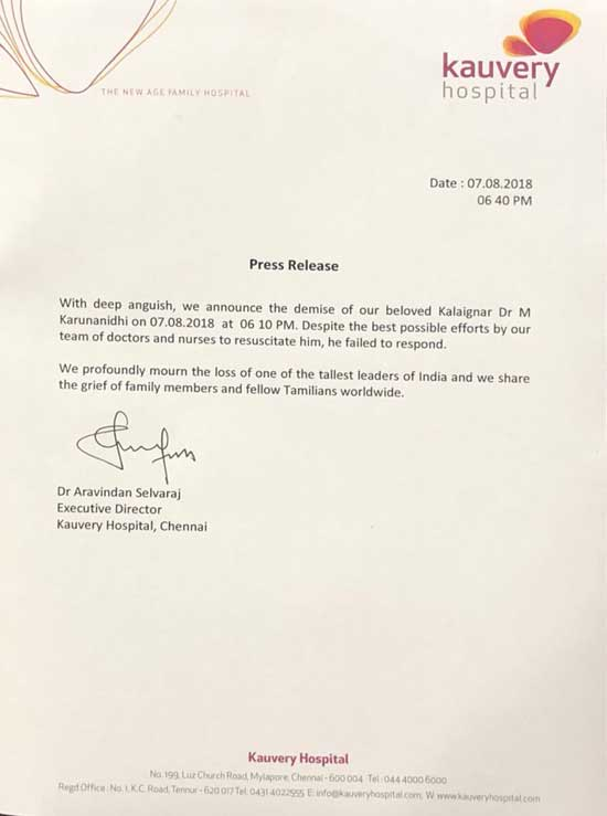 ఈరోజు సాయంత్రం 6.10 నిమిషాలకి తుదిశ్వాస విడిచినట్టుగా చెన్నైలోని కావేరీ ఆసుపత్రి ఒక ప్రకటనలో తెలియచేసింది. గత కొంత కాలంగా వృధాప్యం వల్ల వచ్చే అనారోగ్యంతో బాధపడుతున్న ఆయనకి వైధ్యులు నిరంతరం వైద్యం అందిస్తూనే ఉన్నా ఆయనని మృత్యువు నుండి కాపాడలేకపోయారు.