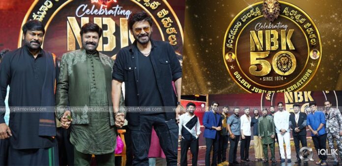 Nandamuri Balakrishna has completed 50 years as an actor. To mark this occasion, the Telugu film industry organized a grand Golden Jubilee celebration in Hyderabad on Sunday. Along with Tollywood celebrities, other film industry personalities and politicians gathered to honor him. Directors who have worked with Balakrishna, along with movie stars such as Chiranjeevi, Venkatesh, Srikanth, Rana, Nani, Gopichand, Shiva Rajkumar, Upendra, Raghavendra Rao, B. Gopal, Paruchuri Brothers, Siddu Jonnalagadda, Vijay Deverakonda, Allari Naresh, and producers like D. Suresh Babu, Gemini Kiran, Suhasini, Indraja, Malashree, and Sumalatha were present at the event.