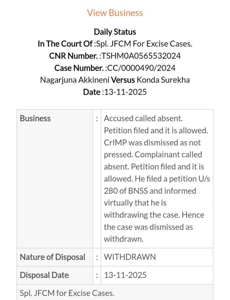 ఈ పరిణామాల తర్వాత, ఈరోజునాంపల్లి కోర్టులో జరిగిన విచారణ సందర్భంగా వర్చువల్‌గా హాజరైన నాగార్జున, తాను దాఖలు చేసిన పిటిషన్‌ను వెనక్కి తీసుకుంటున్నట్లు కోర్టుకు తెలిపారు. కోర్టు ఆయన నిర్ణయాన్ని ఆమోదించడంతో, ఇద్దరి మధ్య నెలకొన్న వివాదం పూర్తిగా ముగిసినట్లైంది.