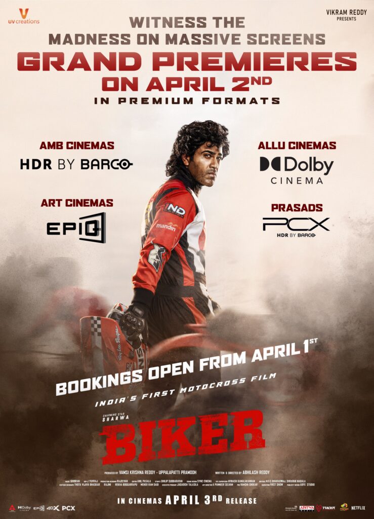 ఇక బైకర్ సినిమా బైక్ రేసింగ్ నేపథ్యంలో తెరకెక్కిన స్పోర్ట్స్ డ్రామా. ఇండియాలోనే తొలి రేసింగ్ సినిమా అని మేకర్స్ చెబుతున్నారు. ఈ మూవీ ప్రీమియర్స్ను Dolby Cinema, PCX, HDR వంటి ప్రీమియం ఫార్మాట్స్లో ఏప్రిల్ 2న ప్రదర్శించనున్నట్లు చిత్రబృందం వెల్లడించింది.
