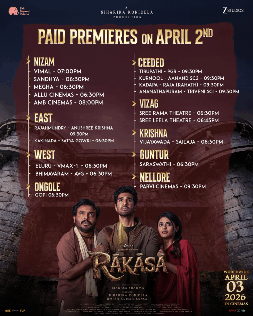 మిస్టరీ-థ్రిల్లర్ జానర్లో తెరకెక్కిన రాకసా సినిమాపై ప్రేక్షకుల్లో ఇప్పటికే మంచి ఆసక్తి నెలకొంది. ఈ చిత్రానికి సంబంధించిన ప్రీమియర్ షోలు తెలంగాణ, ఆంధ్రప్రదేశ్ రాష్ట్రాల్లో ప్రత్యేకంగా నిర్వహించేందుకు నిర్మాతలు ప్లాన్ చేస్తున్నారు.